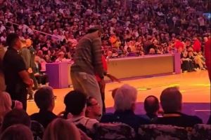 手痒了!湖人vs热火第四节暂停期间 詹姆斯在篮下认真练习运球